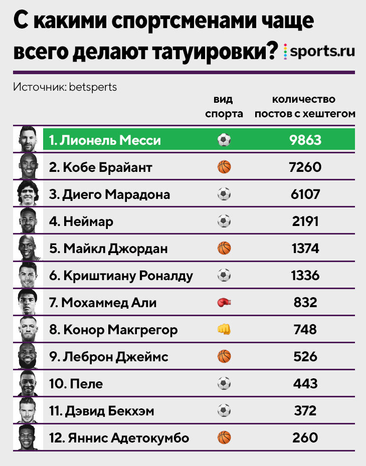 С кумиром – на всю жизнь. После победы Аргентины на чемпионате мира в стране случился бум на тату: в соцсетях сотни постов с татуировками героев − среди главных кадров, конечно, Лионель Месси, целующий заветный кубок. Таких постов было так много, что BetSperts провела исследование: посчитали количество постов в инстаграме по тегу в виде #ФамилияспортсменаTattoo. Методика не идеальная, но достаточно показательная. Вот результаты. • Дальше количество татуировок сильно проседает: 13-й − Льюис Хэмилтон (91 тату). • Авторы исследования нашли 26 персон, татуировки с которыми делали больше 20 раз. Среди них 10 представителей футбола (вряд ли кто-то помнит сэра Алекса как игрока), 7 баскетболистов, 3 боксера и 2 автогонщика. • Четыре вида спорта дали по 1 представителю в топе: Конор Макгрегор (ММА), Том Брэди (американский футбол), Тайгер Вудс (гольф) и Дерек Джитер (бейсбол). • Самая популярная женщина-вдохновитель − Ронда Раузи (13 татуировок). Это 30-й результат среди всех спортсменов. Ниж