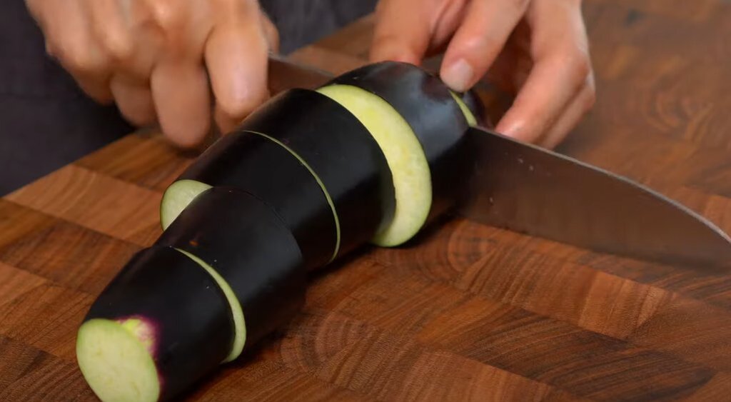 Предлагаем вам приготовить вкусное блюдо, которое очень быстро и легко приготовить из баклажанов. Понравится вам и вашей семье. Ингредиенты: 1. Баклажан - 2 штуки 2. Зеленый лук - 1 пучок 3. Порошок чили - 1/2 чайной ложки 4. Чеснок - 1/2 дольки 5. Соевый соус - 3 столовой ложки 6. Кунжут - 1 чайная ложка 7. Репчатый лук - 1/4 луковицы 8. Кипяченая вода - 2 столовые ложки 9. Красный перец - 1/4 штуки Как приготовить: 1. Берем баклажаны и нарезаем его на небольшие части, не очищая от кожуры. 2. Далее на частях баклажана делаем квадратные надрезы до половины кругляшка. 3. Нарезаем зеленый лук. 4. Приготовим острый соус для баклажан. В глубокую миску положить мелко нарезанный репчатый лук, добавить к нему мелко нарезанный чеснок, порошок чили, красный перец, соевый соус, воду, кунжут. Все хорошо перемешать. 5. Баклажаны приготовить на пару. Время готовки - 10 минут. 6. После 10 минут готовки выкладываем баклажаны на тарелку, сверху кладем на них нарезанный зеленый лук. 7. Сверху на зелен