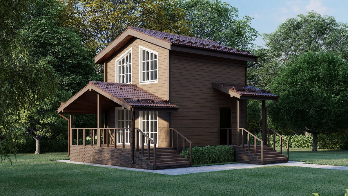 Шикарный СИП дом с мансардой получится по проекту «Каштан». И здесь даже речь не столько о внешнем виде. Хотя дизайн дома просто идеально впишется в любой уголок относительно дикой природы. Да и в коттеджных поселках этот дом оценят по достоинству.