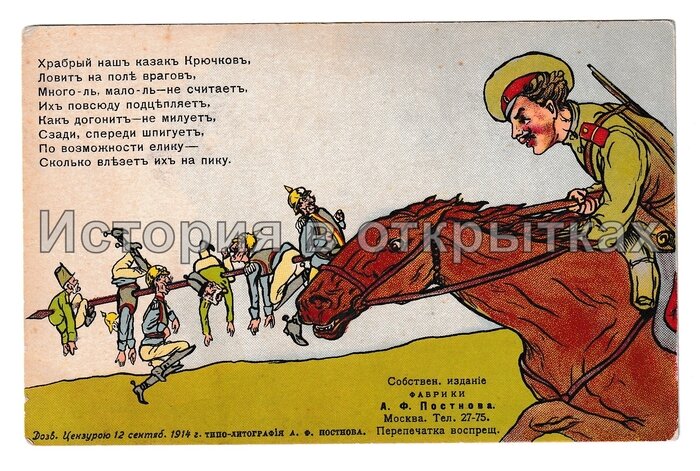 Очередная открытка на моем канале расскажет о герое Первой мировой войне, Донском казаке - Козьме Фирсовиче Крючкове. Лицевая сторона открытки (из личной коллекции). Отсылка с открытки выполненной в жанре карикатуры на самом деле ведет речь о жестоком бое случившемся в ночь на 30 июля (по юлианскому календарю) 1914 года, близ города Кальвария в Польше (на момент описываемых событий Польша входила в состав Российской империи). Оборотная сторона открытки (из личной коллекции). Вот как описал сам бой сам Козьма Фирсович: «Часов в десять утра направились мы от города Кальварии к имению Александрово. Нас было четверо — я и мои товарищи: Иван Щегольков, Василий Астахов и Михаил Иванков. Начали подыматься на горку и наткнулись на немецкий разъезд в 27 человек, в числе их офицер и унтер-офицер. Сперва немцы испугались, но потом полезли на нас. Однако мы их встретили стойко и уложили несколько человек. Увёртываясь от нападения, нам пришлось разъединиться. Меня окружили одиннадцать человек. Не ч