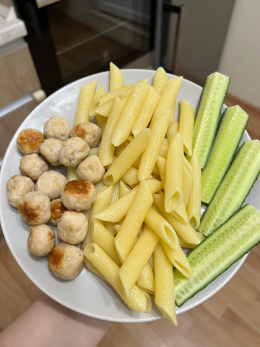 На первый взгляд, такие мини тефтели долго делать, но это не так. На формирование тефтелек у меня ушло 10 минут. Нам понадобится: -куриный фарш 400 гр -макароны 1/2 пачки -соль, специи по вкусу В фарш добавляю соль и приправу для курицы. Перемешиваю и начинаю формировать тефтельки. Выкладываю на сковороду, где предварительно растопила масло гхи. Когда закончили формировать тефтели, включаем плиту и обжариваем до золотистого цвета. Так как размер маленький, тефтели успевают приготовиться и не подгореть. Параллельно варим макароны. Ну и конечно, при подаче я добавила свежие огурцы. Приятного аппетита🍽️