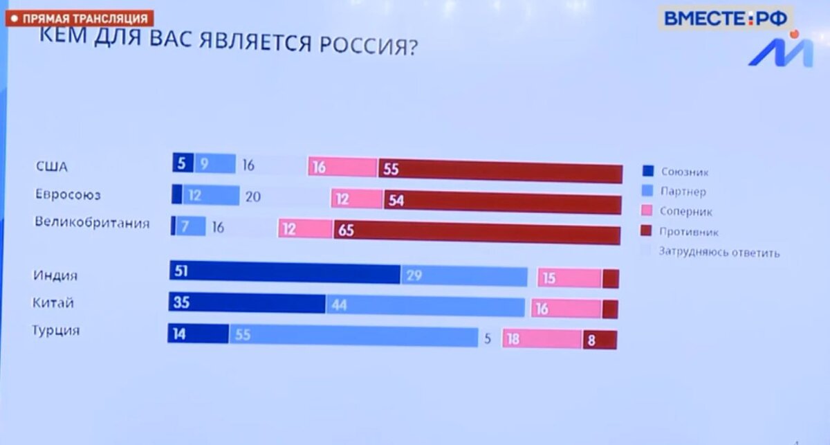 Несмотря на экономический кризис, политическую нестабильность и огромные издержки, большинство жителей стран-членов ЕС и НАТО выступают за продолжение конфронтации с Россией и хотят, чтобы Киев продолжал войну. Об этом в ходе совещания в Совете Федерации рассказал российский социолог Андрей Милёхин, передаёт корреспондент «ПолитНавигатора». В ходе собрания Милёхин презентовал доклад «Кризис опросов: как западные рейтинги превращаются в манипуляцию. По результатам мировых и российских исследований общественного мнения», подготовленный исследовательским холдингом «РОМИР». «Предлагалось три варианта: Военный конфликт должен быть остановлен как можно быстрее, даже если Украина проиграет войну; нужно установить западное влияние, и конфликт на Украине – это как раз реализация этого желания; Украине надо отстаивать территориальную целостность даже ценой затягивания военных действий, увеличения числа жертв и беженцев.Если в Индии, Турции, России и Китае большая часть опрошенных отвечает про не