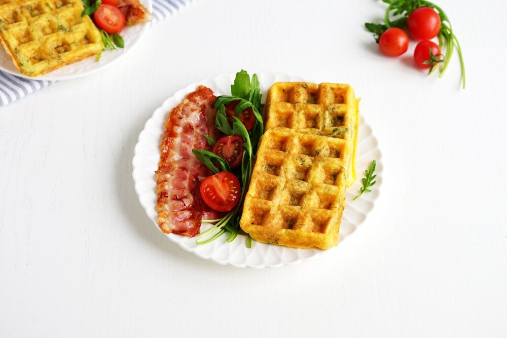 С венскими вафлями можно придумать множество вариантов завтраков. Я часто пеку их из сыра и яиц, а дальше всегда дополняю по-разному. В этом рецепте у меня бекон, руккола и свежие помидорки черри. Другой вариант - положить на вафлю салат, а сверху тонкий ломтик мяса. Или яйцо пашот с хрустящими листьями шпината и т.д. Но, нужно сказать, что эти вафли из 3 ингредиентов на вкус очень необычные и самодостаточные. Без добавок из них получится тоже очень вкусный завтрак. Ингредиенты: