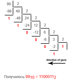 В этой статье я постарался максимально коротко, подробно и внятно(с картиночками). В конце статьи вас ждёт мой краткий алгоритм по поиску все трёх способов изложения информации (кодов). Представим число 99 в двоичной системе. Полная разрядная сетка(1 байт) состоит из 8 разрядов(8 бит). Byte = 8 bit Число 1100011 двоичной системы состоит из 7 разрядов. По одной цифре на ячейку. В случае, когда компьютеру нужно сохранить число без знака(положительное), он заполнит разрядную сетку недостающими нулями. (То есть, если бы число состояло из 6 разрядов мы бы дописали 2 нуля для заполнения разрядной сетки). Но что если мы дадим компьютеру число -99? Для этой задачи и существует прямой, обратный и дополнительный код. В случае прямого кодирования компьютер возьмёт ту же разрядную сетку (представлена выше), но первой ячейке(биту) придаст значение "знакового бита". Как можно было уже понять из прошлого примера: "0" в ячейке знакового бита означает "+", а "1" означает "-". Прямой код двоичной сист
