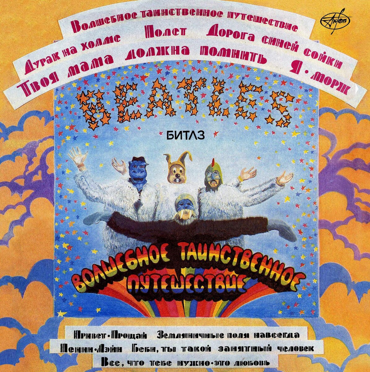 Beatles, Битлз Первоначально альбом "Magical Mystery Tour" ("Волшебное тайное путешествие") группы "Битлз" был издан в США 27 ноября 1967 года, затем он был издан в 1971 году в ФРГ и только лишь в 1976 году уже в Англии, на родине самой группы. До этого все песни, представленные в альбоме, выходили в Англии на пластинках 45 оборотов в минуту, в форматах синглов. Между тем, песни, вошедшие в альбом "Волшебное тайное путешествие" принадлежат к числу лучших, созданных "Битлз" в самый яркий и плодотворный период их творчества. Без них ни одна "Битлз" коллекция не может считаться хоть сколько-нибудь полной. Первая сторона пластинки представляет музыку из фильма "Волшебное тайное путешествие", премьера которого состоялась 26 декабря 1967 года на "Би-Би-Си", Фильм, это собственный проект "Битлз". Он вызвал насмешки критиков и разочарование поклонников. Лишь замечательные песни обеспечили ему достойное место в истории музыкальной культуры. Заглавная песня служит предисловием к фильму и к ал