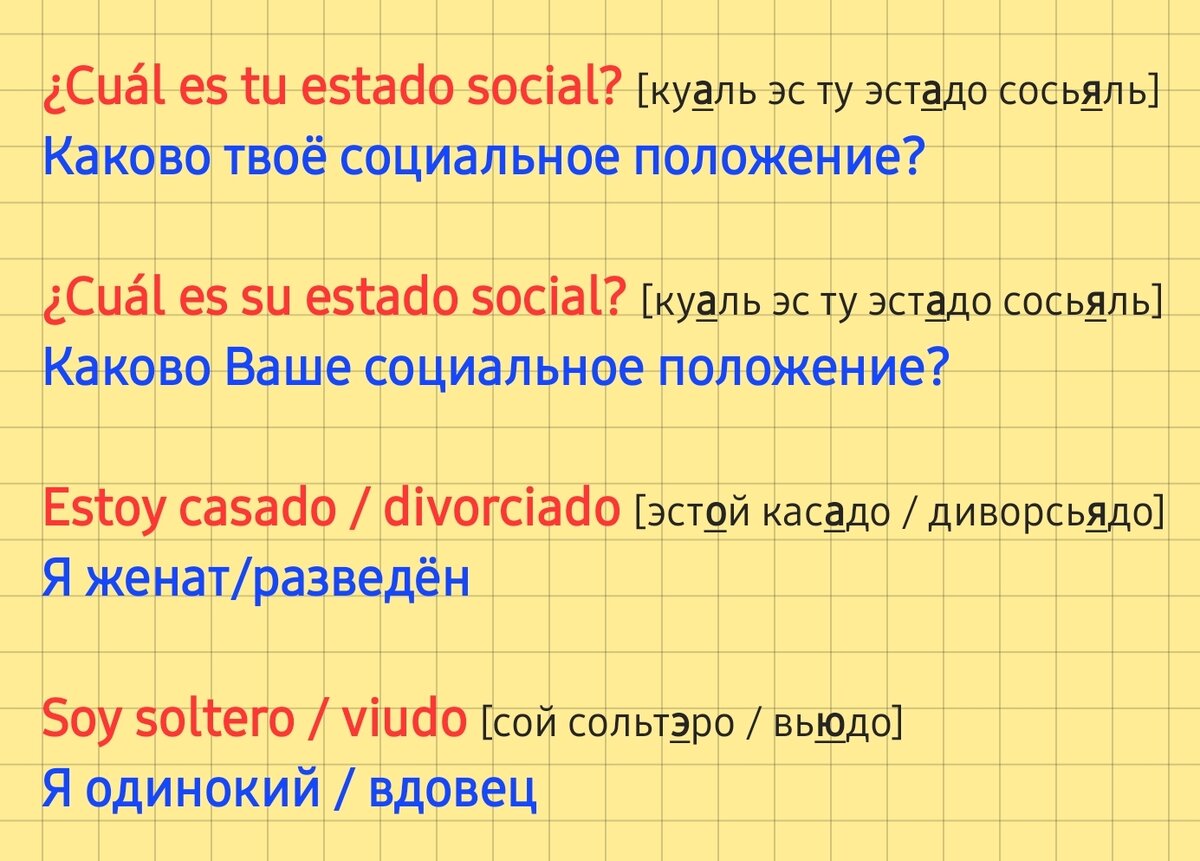 ¡Buenos días! На этом уроке поучимся говорить про социальное положение, также частично затронем тему "Семья". Прежде чем перейдём к упражениям, обратим внимания на два момента. Во-первых, в женском роде у всех четырёх слов будет окончание a, во-вторых, casado и divorciado используются с estar, а soltero и viudo с ser. ¿Está Usted casado? – No, soy soltero. / Вы женаты? – Нет, я холостой. ¿Estás divorciado? – No, ahora soy viudo. / Ты разведён? – Нет, сейчас я вдовец. ¿Estás casado? – Sí, estoy casado. / Ты женат? – Да, я женат. ¿Es Usted soltera? – No, estoy casada. / Вы не замужняя? – Нет, я замужем. Добавим в наш словарик несколько новых слов. Построим с ними словосочетания. mi padre – мой отец, tu madre – твоя мать, su marido – Ваш муж, mi mujer – моя жена, tu padre – твой отец Да-да, на предыдущем изображении на самом деле 8 новых слов. Кто знает, тот уже понял, а кому это правило незнакомо, с удовольствием расскажу. В принципе, и рассказывать-то особо нечего, заменяем o на a и