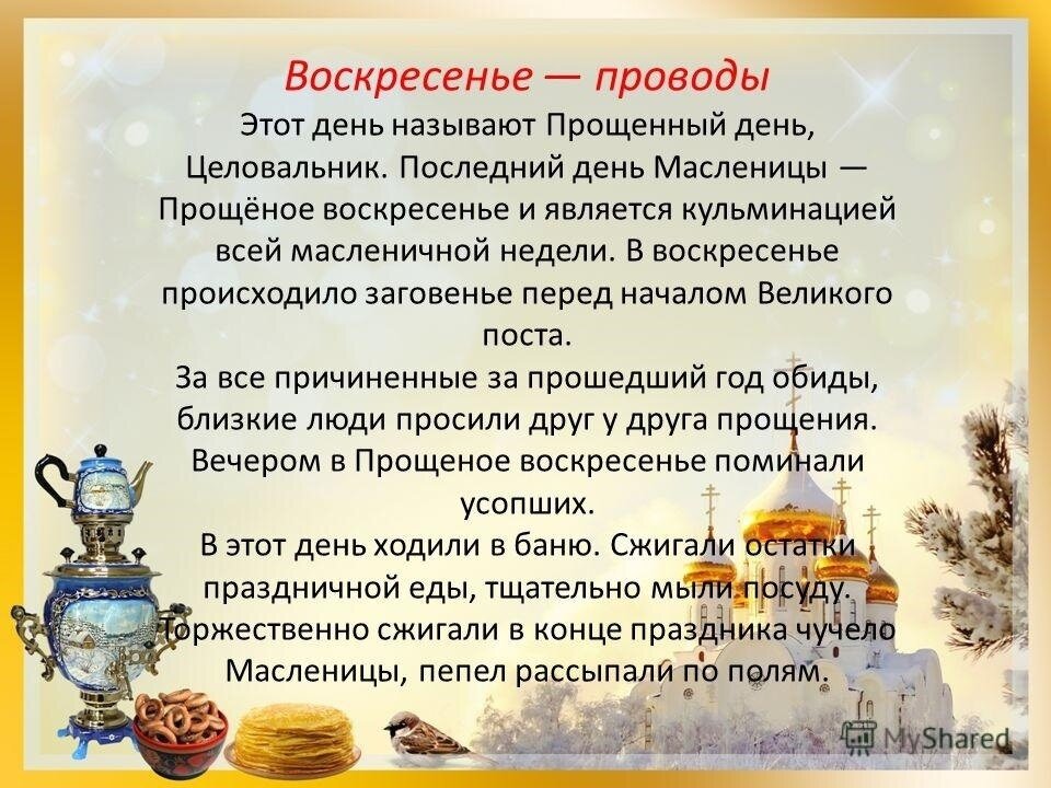В этом отрывке можно проследить, что Семик (Проводы весны) и Масленица (Проводы зимы) занимают особое место в славянском календаре. Довольно таинственно звучат слова этого заклинания "тридцати братов сестра, сорока бабушек внучка". В первом числе можно усмотреть число дней в месяце, а во втором - отголосок старинного славянского календарного счёта "сорок". Почему же Масленица "внучка сорока бабушек"? Можно вспомнить, что для определения начала Радуницы (посевной) и Семика (Проводов весны) славяне использовали это число. Если мы используем тот же метод и к дате зимнего солнцестояния прибавим 80 (2 раза по 40), то получим начало Масленицы. В приведённом заклинании использован метафорический язык: первые сорок дней после зимнего солнцестояния - это "сорок бабушек", следующие сорок дней - это, очевидно, матушки, а последующие 9-10 дней - это "внучка" Масленица. Не удивительно, сколько раз в этом заклинании Проводы весны (Семик) перекликались с Проводами зимы (Масленицей). Таким образом днём начала Масленицы будет 12 марта, а закончится она Прощёным днём 19 марта - последним днём перед весенним равноденствием, которое в этом году будет 20 марта. Последний день перед весенним равноденствием является последним днём астрономической зимы и одновременно последним днём года. Логично было бы в этот день и попрощаться с годом и зимой. Своё название этот день получил от старинного славянского ритуала прощения обид и грехов, носящего очистительный, доверчивый, почти детский характер. Ритуал прощения носил вневременный характер: славяне просили прощения у живых родственников и знакомых, посещали кладбища и, сотворив три поклона, просили умерших предков о прощении обид. Этот праздник носил и другие названия: "Целовальник", "Прощание". Ведь после взаимного прощения обид славяне целовались между собой. Этот ритуал означал заключение мира и согласия между целующимися. Название "Прощание" могло быть связано не только с обрядом прощения взаимных обид, но и с обрядом прощания с минувшим годом.