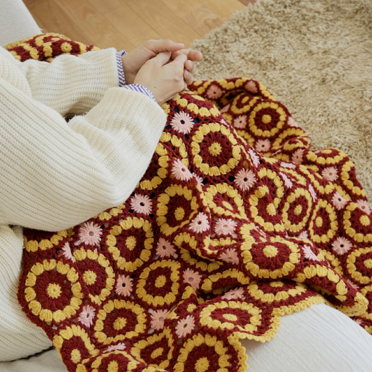 Цветочный плед крючком, узор похож на подсолнухи
