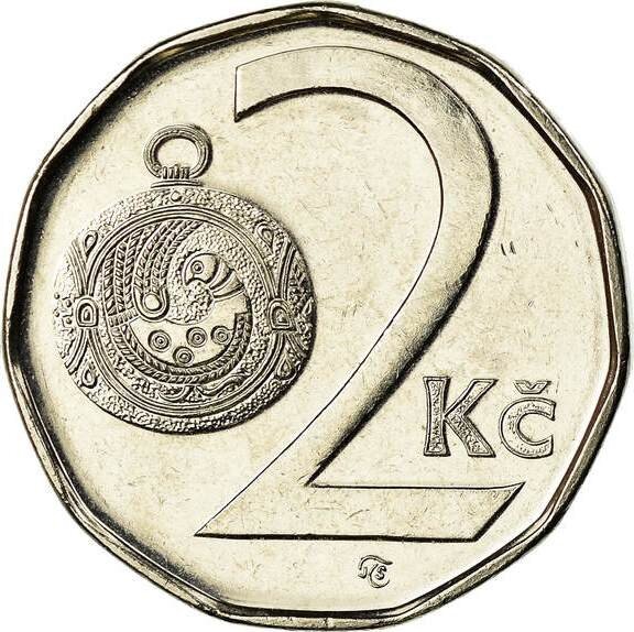 На самом деле, понять, что изображено на большинстве чешских монет, нетрудно. Но вот изображение на монете достоинством в две кроны может вызвать затруднение. На реверсе, понятно, гербовый чешский лев. А что за неведомая штука на аверсе? Прежде, чем говорить об этом, расскажу, что дизайн монеты разработан Ярмилой Тругликовой-Спеваковой. Она же придумала оформление монеты достоинством в одну крону, и об этой монете я уже писал. Одиннадцатигранная монетка сделана из никелированной стали. Ее толщина - 1,85 мм, вес - 3,7 г. На монете изображено изделие, характерное для государства Великая Моравия в IX-X веках. Такие изделия довольно часто находят в великоморавских погребениях. Так что дизайн - реверанс в сторону моравской части Чехии. "Неведомая штука" состоит из двух соединенных полых полусфер и дополнена ушком. Никто точно не уверен, что это такое. Но из того, что чаще всего их находят парами, а лежат они на похороненных телах в области ключиц, большинство ученых делает вывод: это что-т