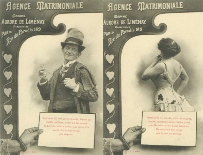 В основном это была газетная колонка – «Пикантные объявления». Указывать антропометрические параметры было не принято. Но в противовес этому объявления без указания образования или принадлежности к определенному социальному сословию считалось моветоном. Комментировать не буду. Читайте! Текст подлинник. Итак, «Молодой человек с торгово-коммерческим образованием и практикой ищет место в бакалейной лавке или конторе с видом на девицу или молодую вдову с апартаментами». «Нужна прислуга, умеющая готовить и угодить изысканному аппетиту одинокого чиновника. Проживание и особое внимание гарантирую. В случае успеха поведу под венец». «М.И. Плотинковская, сестра милосердия и массажистка. Могу сопровождать молодого крепкого мужчину на курорт. Не откажусь от седовласого господина с целью замужества» . А вот еще одно – «Окончившая 8 классов гимназистка с золотой медалью, девица ищет покровителя и, возможно, мужа. Предупреждает, что имеет грех». Вот читаешь, и история перед глазами. Оказываетс