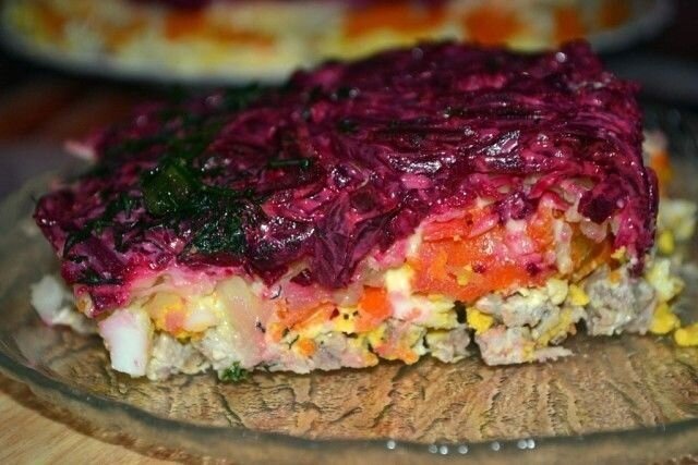Уложить слоями: мясо, сыр, яйца, морковь, свёклу, каждый слой смазать тонким слоем майонеза.