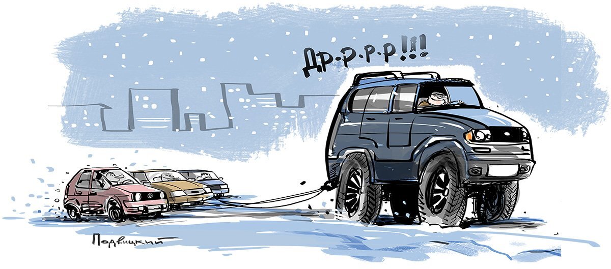 Купил я себе настоящий «джип». Большой, рамный, дизельный, с полным приводом и блокираторами, еще поставил на зиму огромные колеса на дорогой финской резине. И стал ждать, когда я смогу унижать и доминировать. Долго ждать не пришлось, при первом же большом снегопаде город опять встал в огромную пробку. Стою и я в ней, она не движется. Решил срезать через дворы. На зависть стоящим в пробке перемахнул через высоченный поребрик, так же неспешно через две линии трамвайки. Пересек встречку и ушел во дворы. Стойте дальше, неудачники! Только въехав на прилегающую территорию, смотрю — стоят две «грязнухи-ползухи» в колее и визжат маленькими смешными колесиками. Объехать их не могу — мешают припаркованные машины. Беру этих горемык на «галстук» и задним ходом вытаскиваю на дорогу. Все, думаю, дорога свободна, план «бегства» в действии. Но не тут-то было. Как будто, кто-то сообщил о пришествии великого спасителя, и со всех дворов, как муравьи на сладкое, набежали водители с просьбами выдернуть их