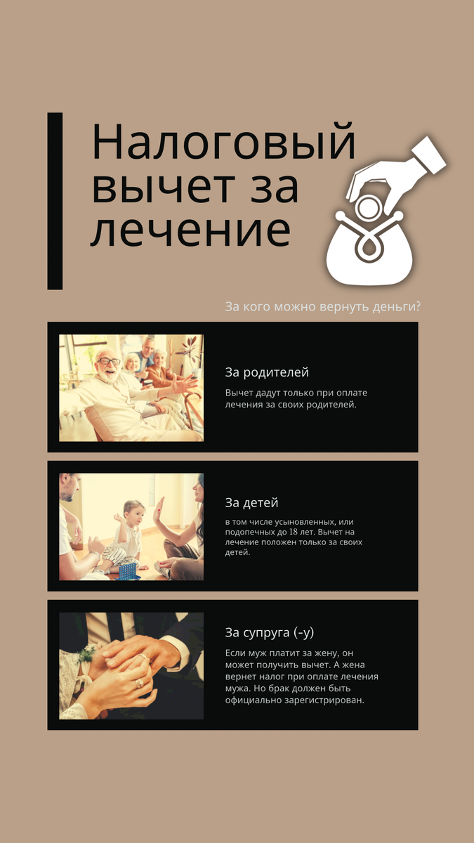 За других родственников вычет получить нельзя. В отличие от обучения, в этом списке нет братьев и сестер. Если оплатить лечение зубов или операцию для родной сестры, получить вычет будет нельзя. За бабушек, дедушек, гражданского супруга, детей жены от первого брака, племянников или тещу налог вернуть невозможно. Список родственников закрытый, и никаких дополнительных условий быть не может. Сколько можно вернуть денег? Существует два типа лечения: Понять, какое лечение именно у вас, можно из справки для налоговой инспекции. Запросить её необходимо в клинике где вы получали медицинские услуги, не всегда огромная сумма расходов является дорогостоящим лечением. Как выглядит справка и где ее взять? Какие документы нужны? Помимо данного вычета, декларация может включать в себя и другие возвраты. Весь перечень налоговых вычетов можно посмотреть на нашем сайте: http://younok.ru/ Ставьте 👍🏻, если информация полезна.