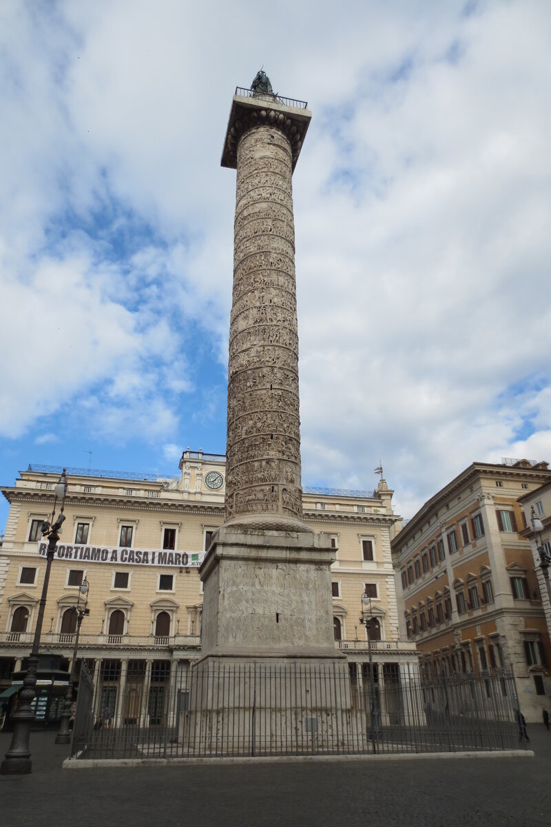 В центре площади воздвигнута в честь Марка Аврелия колонна из белого каррарского мрамора, с барельефами, изображающими эпизоды какой-то войны. Первоначально на вершине колонны располагалась статуя самого Марка Аврелия, но она была, как пишут, «потеряна». Полагаю, что её уничтожили, как памятник язычества. В 1589 году по указанию Папы Сикста V на вершину колонны водрузили статую Святого Петра.