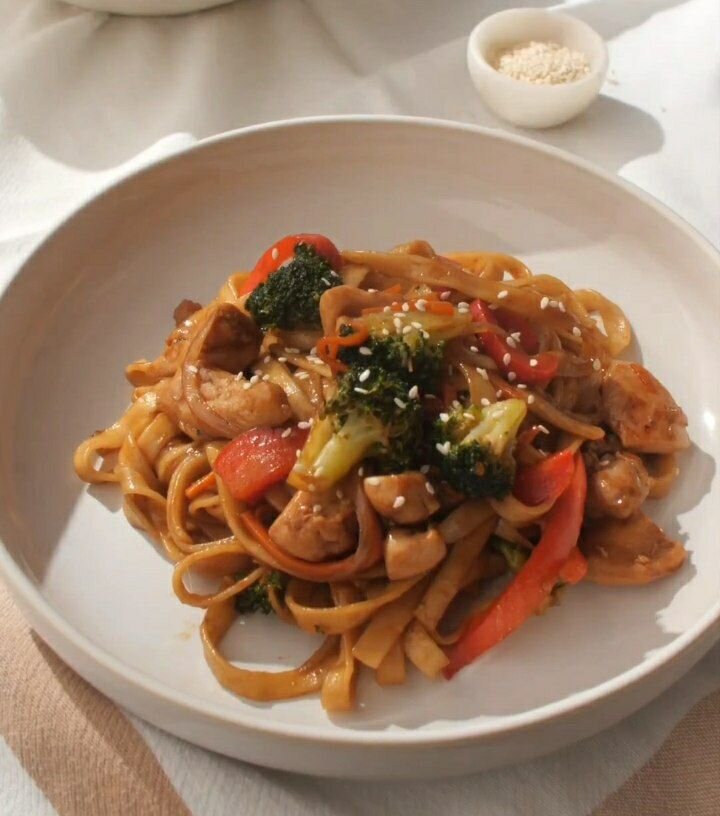 Быстрая лапша с курицей по-азиатски. Все соусы, уксусы можно найти практичкски во всех больших супермаркетах, а если не нашли можно исключить некоторые ингредиенты. Брокколи можно предварительно отварить или бланшировать. Ингредиенты: Соевый соус - 4 ст.л. Устричный соус - 2 ст.л. Кунжутное масло - 1 ч.л. Рисовый уксус - 1 ч.л. Сахар - 1 ст.л. Растительное масло для жарки Куриное филе - 300 г Щепотка соли Чёрный перец Лук - 1 шт Чеснок - 1 зубчик Морковь - 1 шт Сладкий перец - 1 шт Брокколи - 200 г Пшеничная лапша - 300 г Приступаем к готовке. Берём соевый соус и устричный соус, кунжутное масло, рисовый уксус и сахар. Перемешиваем и убираем в сторонку. Далее на растительном масле обжариваем куриное филе, добавляем соль, черный перец (по вкусу). Обжариваем до готовности. Нарезаем лук, чеснок и морковь обжариваем вместе. Добавляем сладкий перец, брокколи можете предварительно отварить, обжариваем. Далее кладём пшеничную лапшу и приготовленный ранее соус. Соединяем все компоненты