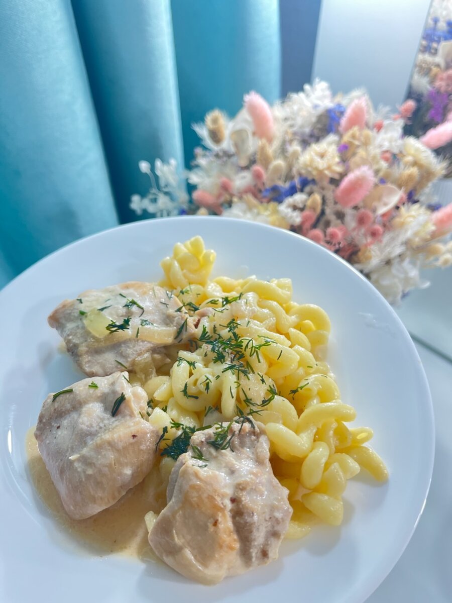 Сковороду раскалите и выложите куски курицы кожей вниз. Можно жать без добавления масла, курица даст достаточное количество жидкости. В противном случае лучше раскалить сковороду с маслом, и на нём уже обжарить курицу. Итак, обжарьте куски курочки с двух сторон до румяной корочки. Добавьте нарезанный маленькими кусочками лук, обжарьте курицу с луком пару минут, затем добавьте измельчённый чеснок. Пока куриное мясо жарится, приготовьте соус - в кипятке или курином бульоне разведите сметану и муку. Комочков быть не должно. Залейте курицу сметанным соусом и доведите его до кипения. Всыпьте соль, чёрный молотый перец. Перемешайте и тушите курицу в сметанном соусе под крышкой до готовности, примерно 20 минут (для домашней курицы понадобится больше времени). Готовое блюдо посыпьте измельчённой зеленью. На гарнир предложите рис, картофель или макароны. Приятного аппетита!
