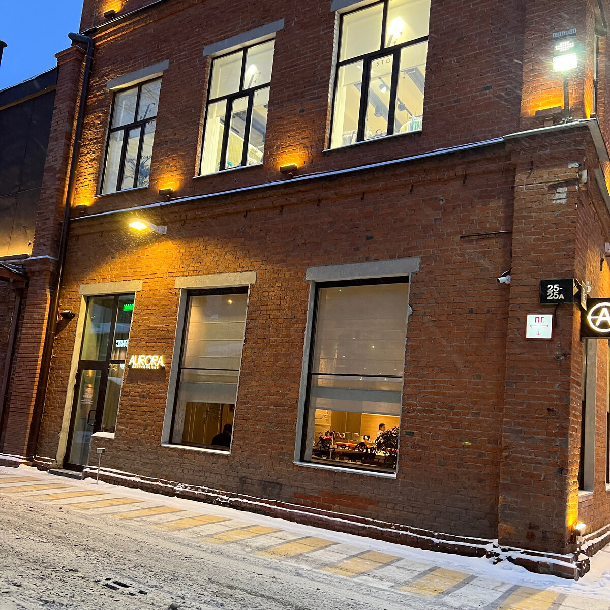 Теперь о самом предприятии. Трехгорная мануфактура, бывшее текстильное предприятие, а нынче деловой квартал, где прописались несколько точек общественного питания, включая (с недавних пор) бистро Aurora, которое открыли Елена Мехоношина и Анна Смирнова. Находится сие заведение ближе к улице 1905 года, там, где сидят Uhvat, кафе «Дружба» и «Раковарня на Трехгорке». Так что заезжать на территорию лучше с набережной под шлагбаум мимо пустующих бывших заводских корпусов. Богиня зари (если название отсылает к ней) заняла угловое помещение первого этажа. Сбоку черно-белая вывеска-кругляшок. Внешняя стена в больших окнах с видом на красный кирпич, заснеженные дорожки и помойку. Вход через одиночную дверь сбоку.