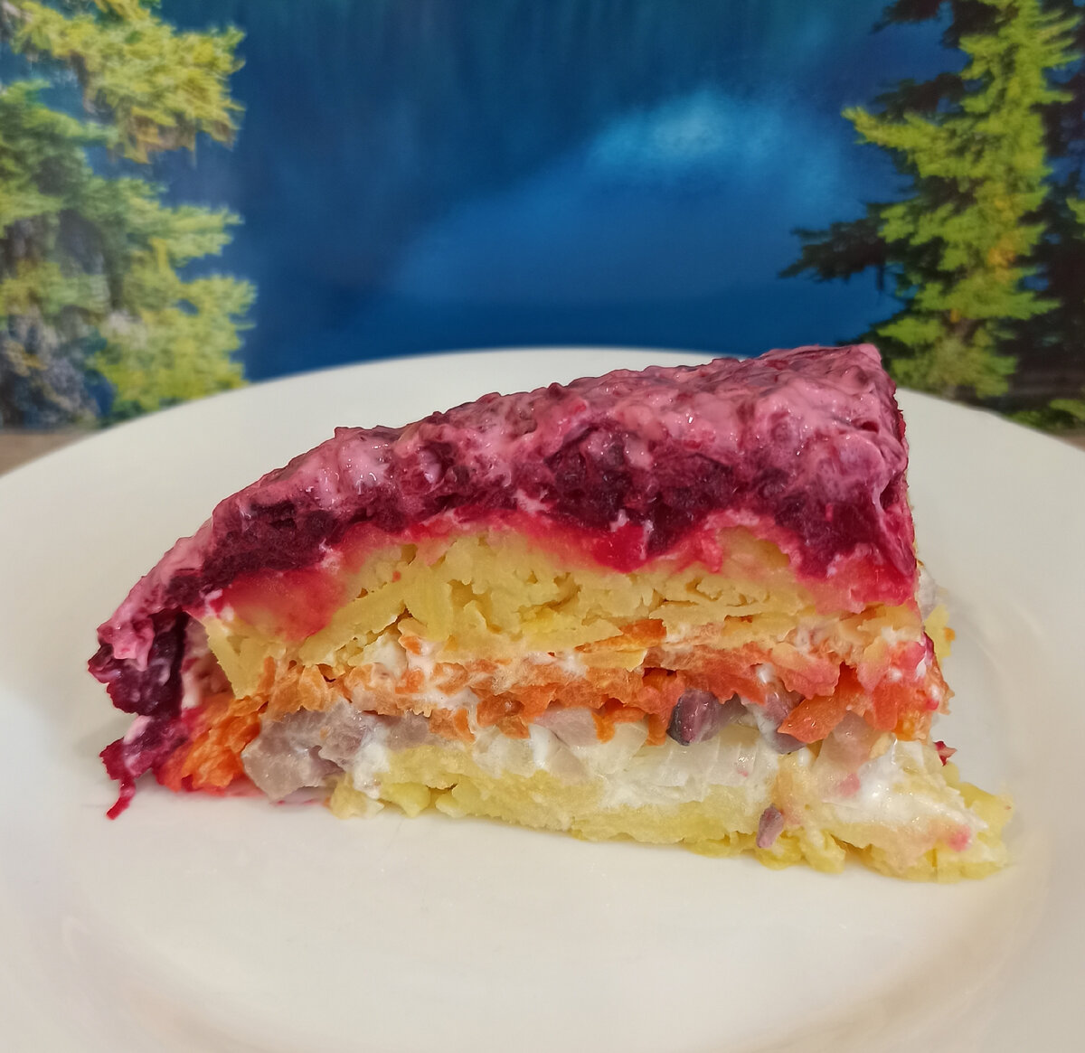 Самый популярный салат на праздничном столе-это селедка под шубой. Есть много людей, кто не любит рыбу, но именно в этом варианте, она может понравиться даже привередам. Способ приготовления. Салат состоит из нескольких слоев отварных овощей промазанных майонезом. Что касается количества каждого овоща, точно сказать не смогу, вы ориентируйтесь на свою посуду. Возможно вы не любите вареную морковь, добавьте ее в меньшем количестве. А может вам не по душе картофель, сделайте моркови больше, а картофеля меньше. В общем все на ваше усмотрение. Есть специальные тарелки для этого салата, они имеют овальную форму, но вы используйте, ту, которая у вас есть дома. Все сваренные овощи в мундире необходимо очистить от кожуры. Заранее репчатый лук режем мелким кубиком и заливаем кипятком. 1. Первым слоем у нас будет картофель. На крупной терке натираем от 2-3 картофелин. Если картошку варили уже в соленой воде, то присаливать сверху не надо. Я забыла посолить, сверху немного присыпала солью. 2