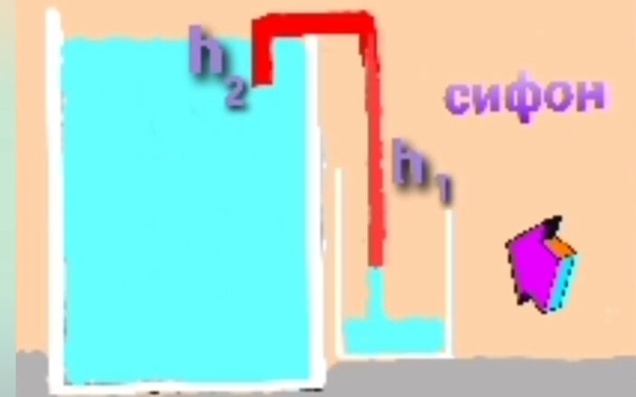 Если взять трубочку для сока, гофрированную в определенном месте, то ее можно использовать как устройство для перетекания жидкости из большого обьема сосуда. Благодаря чему происходит перетекание? Каковы расчеты?Посмотрим видео: Гофрированная часть делит трубочку на две неравные по длине части. В этих частях разные давления столбов жидкости, которые вычисляют по формуле: Р=pgh, где Р - давление, g = 9,8м/с2, h - высота столба жидкости, p- плотность жидкости. Почему называют "столбом"? Это связано с тем, что давление жидкости на дно сосуда не завсит от формы сосуда, а зависит только от уровня жидкости по отношению к дну сосуда. Итак, мы имеем два давления ( две части трубочки): Р1=pgh1, P=рgh2. Но, учтем еще и атмосферное давление Ратм. Тогда давление столба жидкости в длинной части ( не забываем закон Паскаля): Р1=pgh1- Pатм , в короткой части: Р2= pgh2- Pатм. Течение жидкости образует разность давлений:Р1-Р2= Ратм взаимно уничтожатся. Получаем разность давлений: (pgh1- pgh2). В