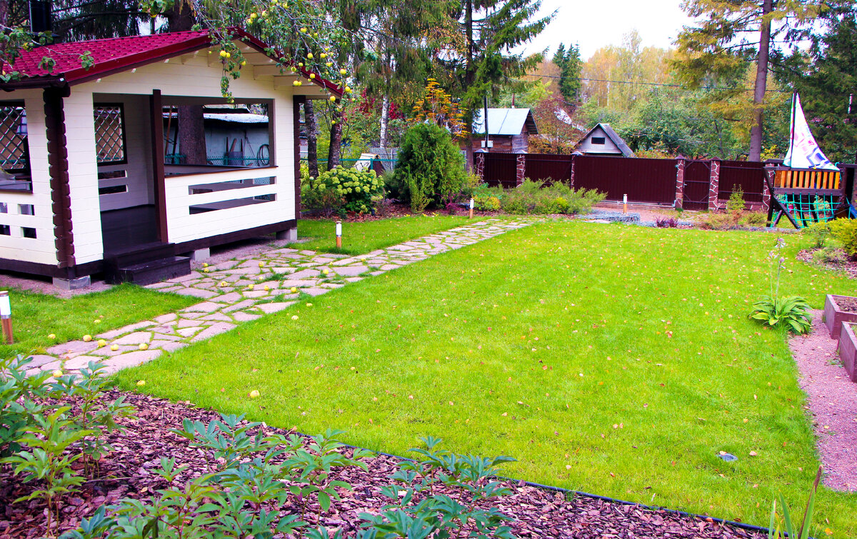 Этот сад мы сделали в одном СНТ по Новорижскому шоссе осенью 2015-весной 2016 года. Общая площадь участка - 12 соток. Особенностью территории является наличие довольно значительного уклона, что делало участок не очень удобным для использования. Дорогих решений, с применением подпорных стен из бетона, с заменой существующего забора, нужно было избежать. Выход был найден. Мы решили использовать габионы. Территория сада, согласно проекта, была разделена на три уровня. Первый уровень был образован при строительстве дома, когда была выровнена площадка в верхней части участка. Следующий, второй уровень и был образован габионами, выстроенными в виде буквы П. При этом боковые стороны стенки из габионов отступают от забора на 1-2 метра, и там сохраняется естественный уклон участка, что весьма удобно при обслуживании сада, когда надо пройти с тачкой, а спускаться по лестнице на садовой дорожке не вариант. Терраса, образованная габионами, имеет максимально выровненную поверхность, и на ней размещ