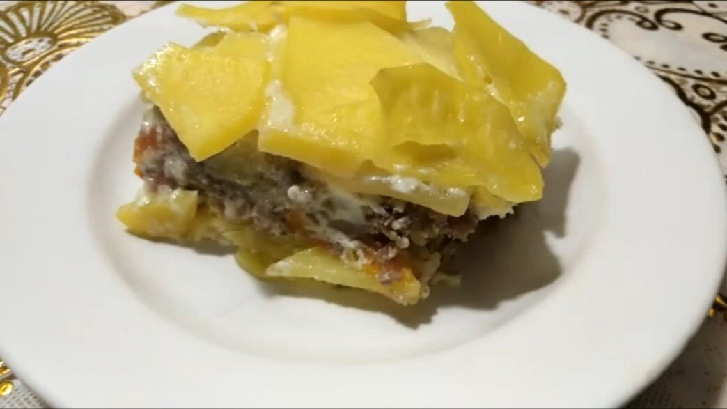 Сытное и простое блюдо, которое понравится всем, кто любит вкусно покушать. Его можно подать и на обед и на ужин. Никаких сложностей в приготовлении. А в итоге получаем вкусное блюдо в духовке. Рецепт: Нарежем лук, морковь и обжарим. Добавим фарш, посолим, поперчим. Яйца взбить со сметаной, посолить. В форму выложить картофель. Сверху положить фарш. Следующий слой - картофель. Зальем яйцом со сметаной Поставим в духовку на 50 минут при 180 градусах. Форму можно накрыть фольгой. За 20 минут до готовности фольгу убрать. Ссылка на видео:
