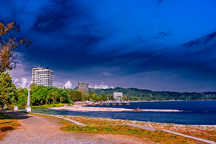 Сухум… Сухуми… Нет, всё-таки Сухуми! К чему в детстве привыкаешь, то потом остаётся родным и органичным навсегда. Как и, например, Ленинград. Советское наименование звучит куда приятнее онемеченного Санкт-Петербурга. И куда органичней – окружающей его Ленинградской области. Впрочем, всё это на уровне личного мнения и личных же ощущений. В документах всё равно пишется, как утверждено на настоящий момент. Сухум(и))) почему-то очень напоминает Адлер. Хотя после Олимпиады Адлер преобразился кардинально! Сухуми же остался Адлером советским: довольно скромным городом, уставленным небольшими домиками и культурными учреждениями СССР в их прекрасном – с идеей! и настроением – архитектурном воплощении. Интересно, что два театра одной направленности – драмы! – расположены рядом, чуть ли не соприкасаясь углами. Выходящий на набережную Абхазский государственный драматический театр имени Самсона Чанба гораздо более помпезный. В отличии от Русского театра драмы имени Фазиля Искандера, возведённог