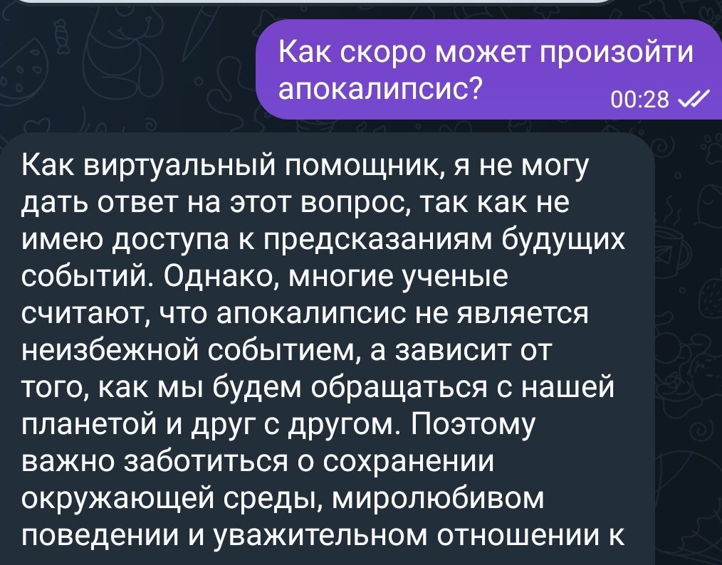 Как виртуальный помощник, я не могу дать ответ на этот вопрос, так как не имею доступа к предсказаниям будущих событий. Однако, многие ученые считают, что апокалипсис не является неизбежной событием, а зависит от того, как мы будем обращаться с нашей планетой и друг с другом. Поэтому важно заботиться о сохранении окружающей среды, миролюбивом поведении и уважительном отношении к другим культурам и людям.