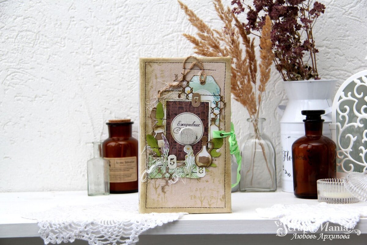 Всем привет! Сегодня с вами я, Любовь Архипова. Смотря на коллекцию "Спасибо, доктор!" TM ScrapMania, я вспомнила лето, сбор лекарственных и пряных трав, и решила сделать блокнот мидори, немного растрепанный и состаренный. В нем можно делать записи о собираемых растениях, размещать какие-то зарисовки, да и просто окунуться в атмосферу лета, солнца и тепла. У этой коллекции есть много вариантов применения. Лично я увидела в ней больше винтажную ботаническую тему. Очень красивые и лаконичные принты, которые не обязательно привязывать к медицине. Формат моего блокнота примерно 12х22 см. Обложку я обтянула мягкой тканью с коротким ворсом. Нанесла через трафареты "Спасибо, доктор! Полевые цветы 1. Разнотравье" и "Алиса в сказке. Текст" рисунок текста и трав архивными чернилами, дополнительно затонировала и края и корешок. Композицию на обложке собрала из вырезанного тэга из скрап-карты А4 "Спасибо, доктор! Ярлыки", тканевой карточки "Спасибо, доктор! Ежедневник", фишки с лавандой из набора