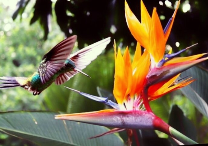 Стрелицию также называют райской птичкой из-за того, что ее цветок, расположенный на длинном жёстком цветоносе среди больших зелёных листьев, напоминает это сказочное создание.