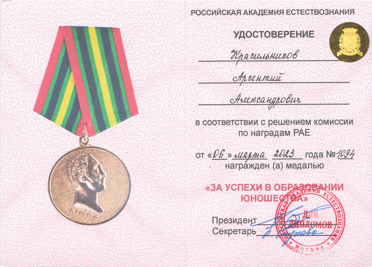 Красильников Арсентий Александрович, заместитель главного редактора журнала "Вопросы профессионального развития персонала", кандидат педагогических наук и доцент, получил высокую награду от Аттестационной комиссии по наградам и премиям Академии Естествознания - почетный диплом и медаль "За успехи в образовании юношества" (№ 1094 от 06.03.2023 г.). Это заслуженное признание его выдающихся достижений в научных исследованиях по педагогике и теории образования, которые способствуют развитию педагогической науки, влияют на общественный прогресс и интеллектуальное развитие, а также подтверждают высокий авторитет отечественной науки в мире. Медаль "За успехи в образовании юношества" - это престижная награда, которая присуждается за значительный вклад в развитие образования и поддержку молодежи. Она является признаком высокого уровня профессионализма и деятельности, направленной на развитие науки и образования в нашей стране. Награждение Красильникова А. А. медалью является ярким примером приз