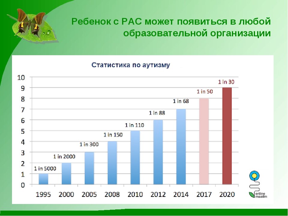 Приводятся примерно такие графики, согласно которым в 1995 году был 1 ребенок с РАС на 5000 человек, а сейчас 1 на 30.