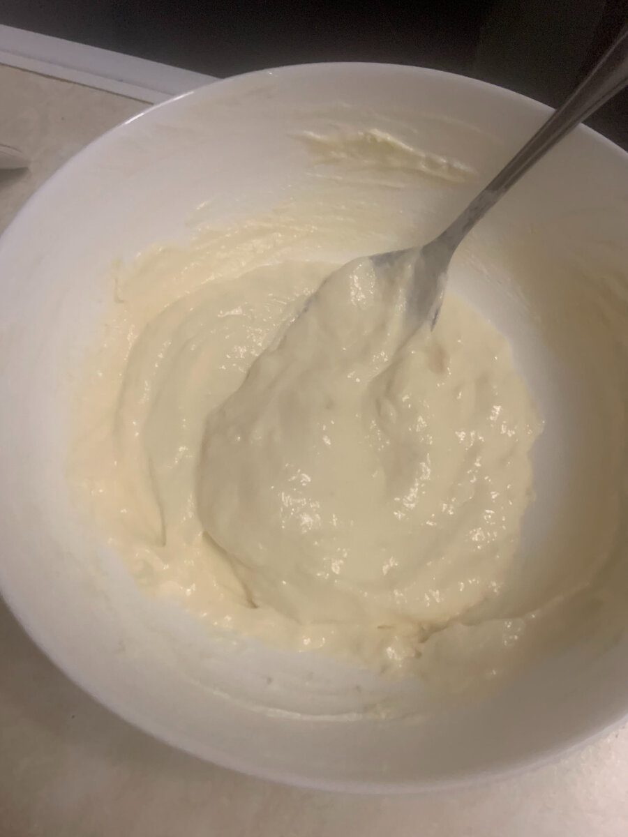 Смешиваем 500 грамм мягкого творога, две столовые ложки муки с горкой, столовую ложку сахара