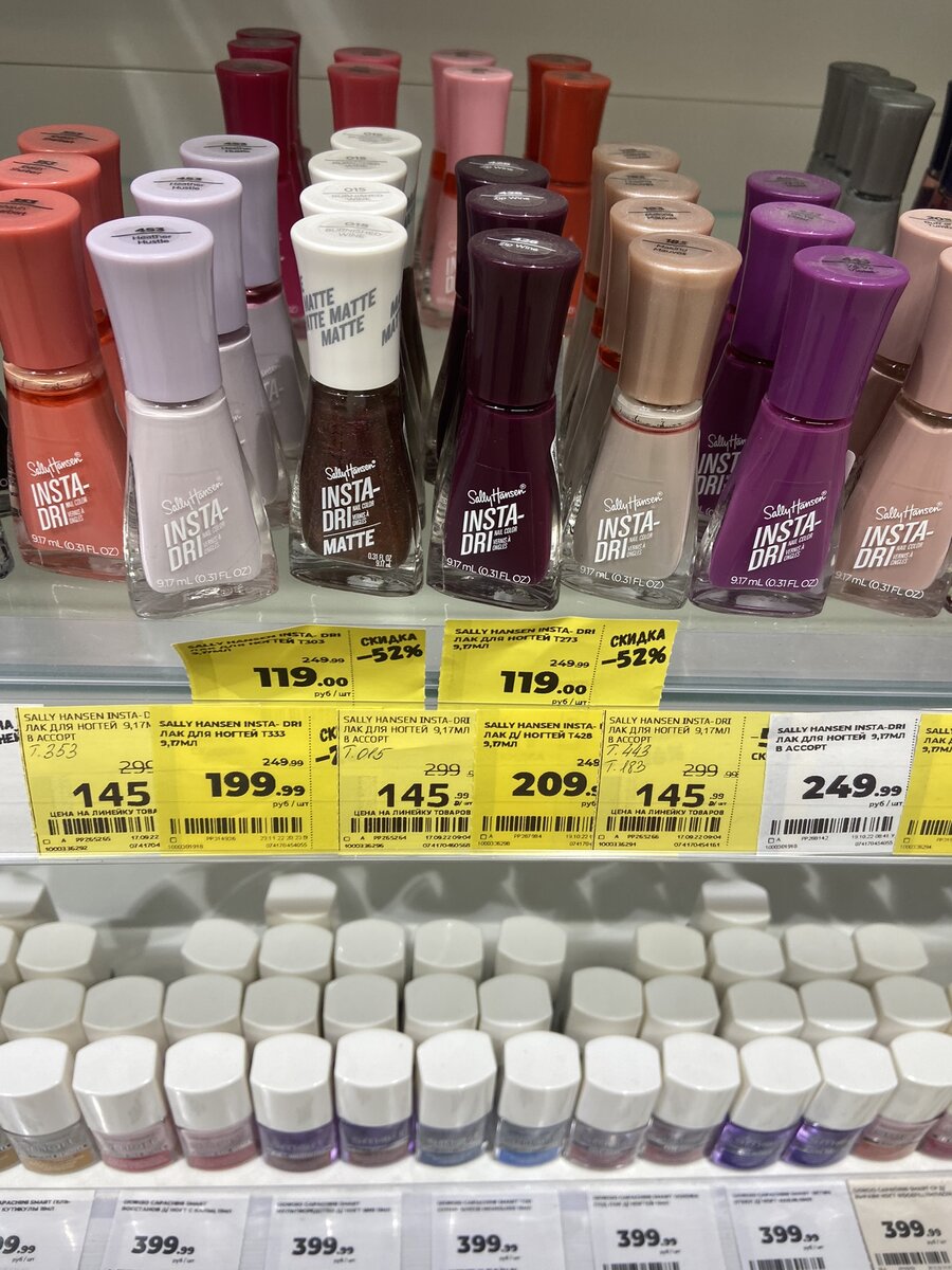 Понравились некоторые лаки от Sally Hansen, хорошая кисточка, многие цвета запали в сердце, удобное нанесение, достаточно быстро сохнет. Фото сделано в «Магнит-косметик», они там по акции, хотя я не сравнивала цены в других магазинах. Но некоторые лаки «полосят» и наносить сложновато…