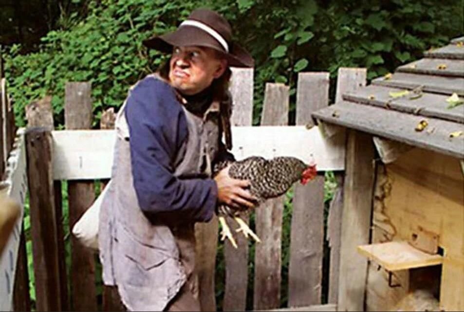 Курица прижималась к человеку и думала: "Как он прижимает и согревает меня! Он меня любит!" В один прекрасный день, курица стала свидетел