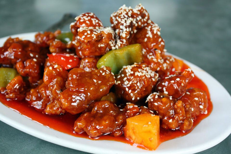 - Подавайте курицу в сладком-остром соусе горячей, украсив зеленым луком.
