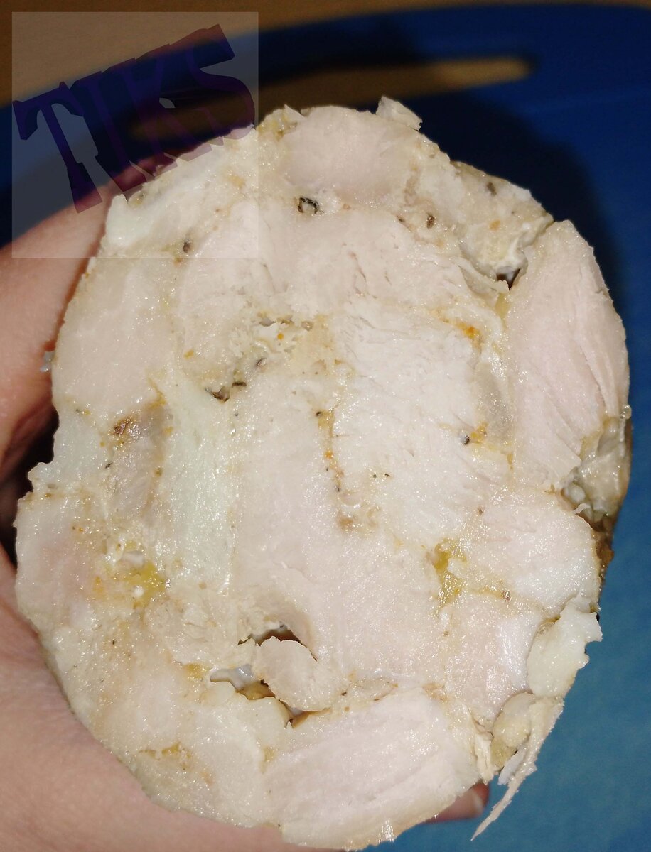 Убираем в холодильник на 2 часа или более. Это важное условие, чтобы природный желатин склеил мясные кусочки. Если развернуть рулет и нарезать его теплым, куски будут распадаться.