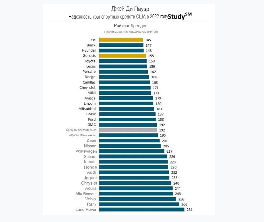 Корейские автомобили заняли первое место в рейтинге JD Power 2022. Первое место досталось Kia, третье — Hyundai (владелец Kia), четвертое — Genesis (лучший в премиум-классе), люксовый бренд Hyundai. Второй год подряд Kia занимает первое место среди так называемых массовых брендов, но впервые за всю историю данного исследования популярный бренд занял первое место в общем зачете. Результат 145 баллов в категории «количество проблем на 100 автомобилей» (РР100) на целых 47 баллов ниже среднего результата по всей отрасли. Только Toyota и Lexus отставали от корейских автомобилей. Последняя зафиксировала значительное падение рейтинга, в котором доминировала в последнее время. За Lexus последовали Porsche (162 PP100), Cadillac (168 PP100) и Линкольн (180 PP100).