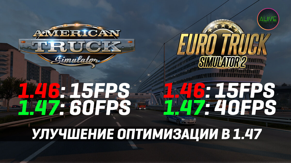 В патче 1.47 для #ATS и #ETS2 разработчики улучшили оптимизацию в ночное время суток, в плохую погоду и при большом скоплении трафика. В этом видео я решил показать наглядную разницу.