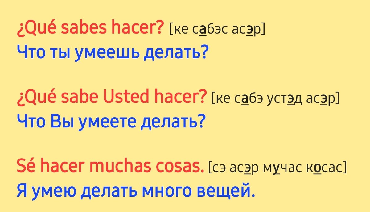 ¡Buenos días! На этом занятии поучимся спрашивать и отвечать, кто что умеет делать, а также узнаем, почему в испанском два глагола "играть" и чем они отличаются. Что интересно, в испанском языке нет глагола "уметь", вместо него используется знать – saber, то есть, испанец дословно говорит "Я знаю плавать", "Мы знаем играть в футбол". Я столько всего умею!)) Добавим несколько новых слов и потренируемся с примерами. ¿Sabe Usted nadar? – Вы умеете плавать? Sí, sé nadar muy bien. – Да, я умею плавать очень хорошо. ¿Sabes esquiar? – Ты умеешь кататься на лыжах? No, pero sé patinar. – Нет, но я умею кататься на коньках. ¿Sabe Usted bailar? – Вы умеете танцевать? Sí, sé bailar y cantar. – Да, я умею танцевать и петь. No sabes cantar. – Ты не умеешь петь. No sé nadar. – Я не умею плавать. Sé esquiar un poco. – Я умею немного кататься на лыжах. Ты играешь или ты трогаешь? А трогать мы с вами сегодня будем... музыкальные инструменты. Да-да, как мы уже сказали, в испанском есть два гла