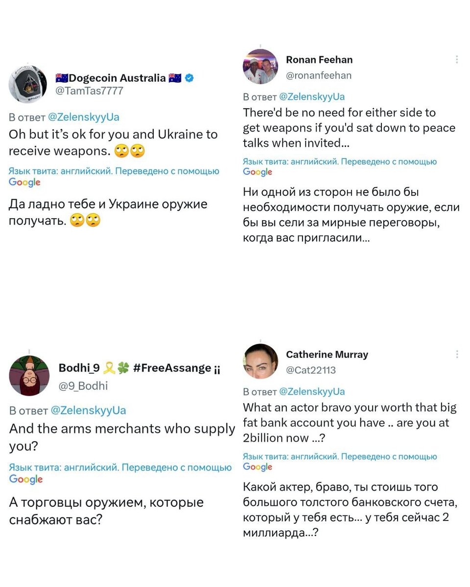 Украинский президент Владимир Зеленский в социальных сетях опубликовал видео, в котором обращается к производителям оружия, передающим его России. «Все те, кто производит оружие для террора против Украины, кто помогает России разжигать агрессию, в частности поставляя беспилотники «Шахед», кто поддерживает разрушение Россией международного права, могут быть только маргиналами для мира», - заявил Зеленский. Пользователи в комментариях отмечают, что украинский лидер упустил возможность мирных переговоров, а еще напоминают, что Украине тоже передают оружие и технику, которое она использует. «Ни одной из сторон не было бы необходимости получать оружие, если бы вы сели за мирные переговоры, когда вас пригласили…», «Они были у вас за столом переговоров, но вы слушали воинствующий Запад!», «Да ладно тебе и Украина оружие получает», «А торговцы оружием, которые снабжают вас?», - отмечают комментаторы. Некоторые пользователи подчеркнули, что Зеленский – отличный актер, но не лидер. На данный мом