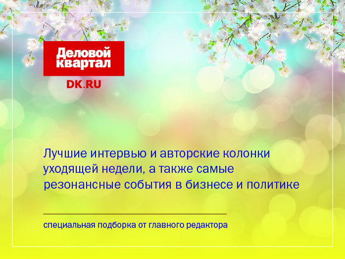 Лучшие интервью и авторские колонки уходящей недели, а также самые резонансные события в бизнесе и политике — в специальной подборке от главного редактора «Делового квартала».