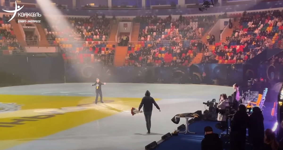 Могла быть другая идея: катает Трусова, а Кузнецов докапывается до неё, бегая за ней с блокнотом или с микрофоном - мол, почему ты "бегаешь от прыжка к прыжку", "ты зачем ушла от Тутберидзе", "почему ты ленивая и неблагодарная" и т.д., ну в общем по хрустальной методичке. Тогда Трусова останавливается, подзывает к себе фаната с цветами, выбегает фанат с цветами из Самары, отбирает у Кузнецова микрофон, лупит его цветами или засовывает ему микрофон за воротник, в общем, была бы динамика. Трусова проезжает мимо Кузнецова в кантеливере и показывает ему средний палец, машет в его сторону ногой, а он рвёт на себе волосы и т.д. - вот это было бы зрелищно.