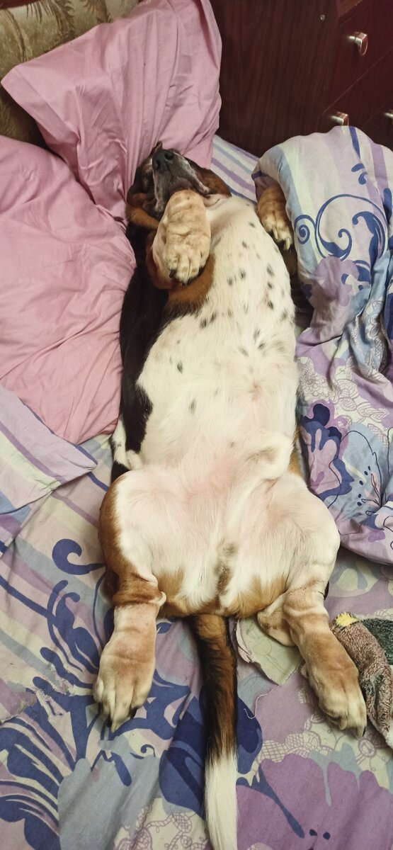 Утром собака Шервуд: Ой, мама, как жаль, что ты, наконец-то, уходишь! Полежу пока во все стороны я. И морду на падушычку положу, и пузо шоп вверх, и пуанты раскидаю по всей кровати! Каеф! А ты иди, иди... У тебя там дела. Я ночью там наделал дел тебе, ты иди. Сурпрыз там у нас в коридоре. Ухожу. Делаю дела, идём гулять, прихожу, кормлю, мою, убираю, чищу - лотки клетки, потом ванну, сантехнику, всё от шерсти, матерюсь словами, которых даже бомжи на мусорках бы постеснялись, устаю и хочу временно поваляться в бесчувствии. Прихожу в спальню с наивной надеждой про "щас полчасика полежу - и буду делать другие дела", интеллектуально трудиться, так сказать. Угу. Щаз. Кроватный аншлаг! Плацкарта скрозь занята - местов нет! А выражения лиц-то! "Ой, нам очень жаль, но тут уже занято всё... Может, ты на коврике под дверью поспишь? У нас такой отличный коврик" 😎 А Шервуд с Пигой ещё и храпят, между прочим! И довольно громко. А Дуся во сне лает и куда-то бежит. Не, ну, я всех подвинула, ко