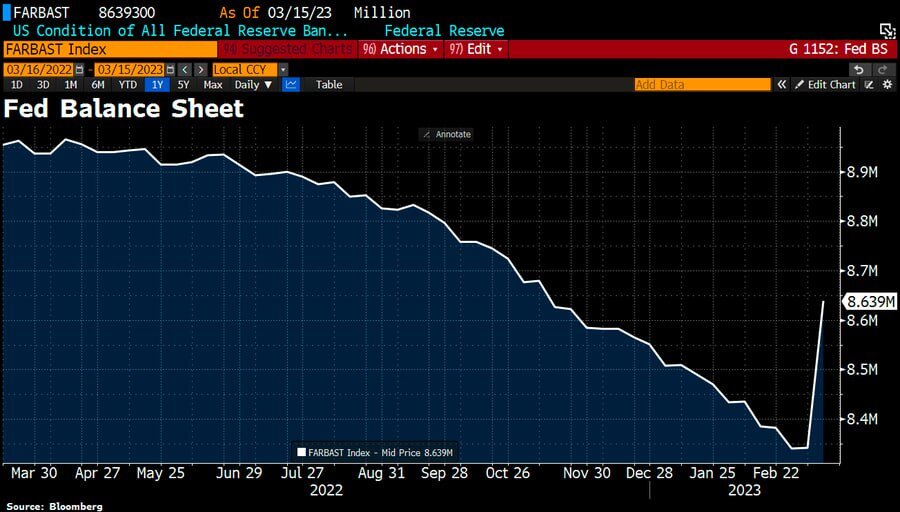 Сразу после крушения банков в США стало понятно, что страх инвесторов может стать катализатором, положившим конец устойчивости банков. Ни один из банков не может пережить отток депозитов, а тут ещё самый быстрый рост ставок в США за многие годы и, как следствие, падение цены на трежеря, которые составляют огромную часть от всех активов банка. Это повлияло на ликвидность банков, которым необходимо фиксировать колоссальные убытки и только после этого они смогут выплачивать деньги по депозитам, и то не все. Поэтому ФРС принял решение спасать банки и заливать их деньгами(подробнее в этом посте). Это привело к тому, что баланс ФРС вырос почти на 300 млрд.$ за неделю, что привело его к уровню октября 2022. То есть, за за пару дней была потрачена та сумма, на которую продал активов ФРС за полгода.