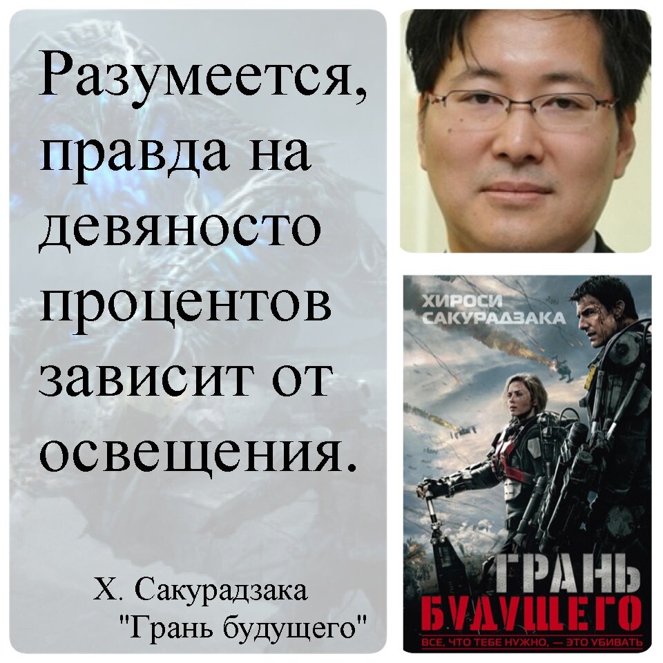 Правда, заинтересоваться и прочитать - вещи разные. А потому до "Грани будущего" добралась только сейчас, спустя почти десяток лет, уже основательно подзабыв сюжет фильма. А прочтя - не с меньшим удовольствием пересмотрела кино. Оказалось, общего между ними - только "по мотивам". Но при этом и то, и то - замечательное.