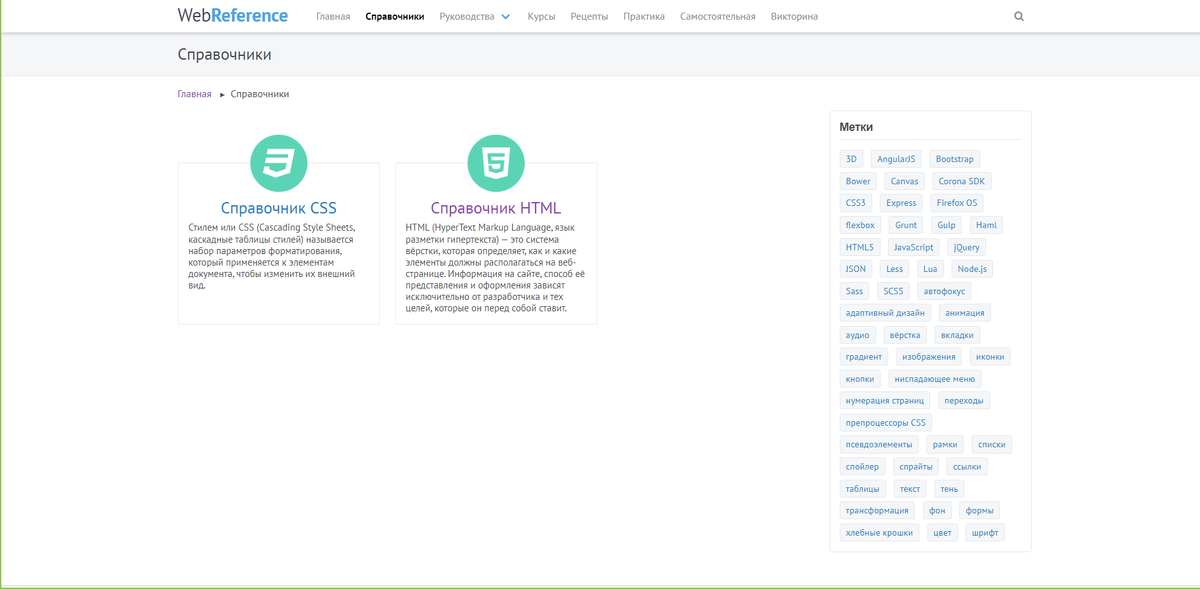 Глава 2. Часть 2. В предыдущем уроке мы узнали, что такое теги и для чего они нужны. Здесь я не буду писать перечень наиболее употребляемых тегов, как это обычно принято на курсах. За меня это уже сделали многие ресурсы. Мы постепенно освоим теги по мере использования их в своих примерах. А пока изучите самостоятельно полный перечень тегов, которые существуют в html и размещены на сайте WebReference, расположенном по адресу: https://webref.ru/html. На сегодняшний день это самый полный и информативный русскоязычный ресурс в интернете по html и css. Как я писал уже ранее, нельзя всё знать. И наша задача научиться находить информацию и умело пользоваться всем тем, что уже создано до нас и для нас. Параллельно с изучением тегов на ресурсе, который уже ранее назвал, попрактикуйтесь в написании тегов. Для этого на данном этапе удобно воспользоваться онлайн сервисом CodePen по адресу https://codepen.io/pen/. На будущее возьмите себе на заметку, что иногда для маленьких экспериментов удобнее и