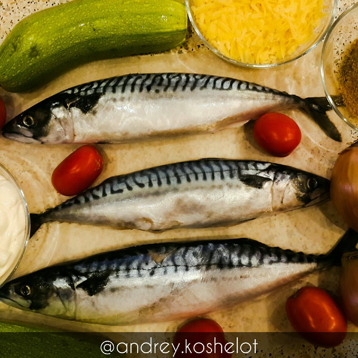 3. Противень смазываем растительным маслом и выкладываем на него скумбрию, все овощи и покрываем майонезом.