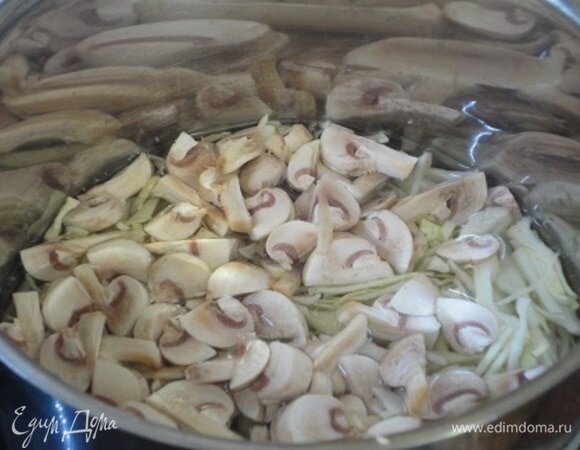зелень рубленая - 1по вкусу Шаг: 1 Свежую капусту нашинковать, шампиньоны нарезать слайсами. Все залить водой и варить 10 минут. Шаг: 2 Лук нарезать мелко, морковь — полукольцами. Обжарить овощи на растительном масле. Шаг: 3 Добавить квашеную капусту и 150 г протертых томатов. Если используете томатную пасту, то разведите ее со 150 мл воды. Все вместе тушить 15 минут. Шаг: 4 Выложить жареные овощи в кастрюлю с грибами, посолить, поперчить. Добавить 1 ч. л. сушеных лесных грибов в виде порошка, лавровый лист и варить 5–7 минут. Шаг: 5 Подавать блюдо с оливками и долькой лимона.