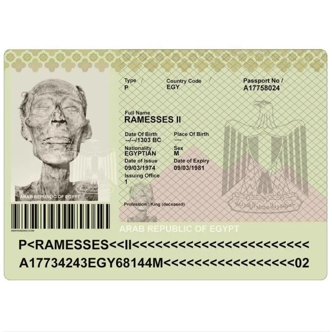 В соответствии с Египетским законодательством, даже мертвый человек (например, при репатриации) может покинуть страну только при наличии паспорта. Поэтому Рамсесу пришлось его выдать