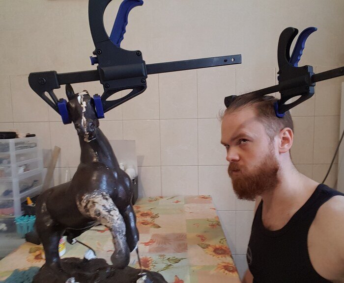 Приветствую! Не бейте меня сильно люди которые занимаются реставраций, но я старался)) Шел 2021год, и попал ко мне в руки конь, точнее его статуэтка. Владельцы коня сказали что создали его в 1918 году, и жил он себе спокойно эти 100 с хвостиком лет и никого нетрогал, а потом Бум! Упал, и разбился. "Починишь? " спросили меня, а я что, мне только в радость! Конь переехал ко мне и подвергся детальному осмотру. Первичный анамнез показал: Материал - гипс. -Отсутствие правой и левой тазовой конечности ниже заплюсны; -Отсутствие пясти правой грудной конечности; -Компрессионная травма запястья; -Трещина крыши черепа по наружному сагитальному бугру; -Частичное отсутствие части правой ушной раковины; Вдохновившись парочкой видео по реставрации гипсовых статуэток (не так уж их и много, инфы не густо) Приступил к подбору материалов для лечения данной животинки. Для формирования новых конечностей была выбрана масса Darwi "Roc" - это самозатвердевающая полимерная глина, предназначенная для лепки. ht